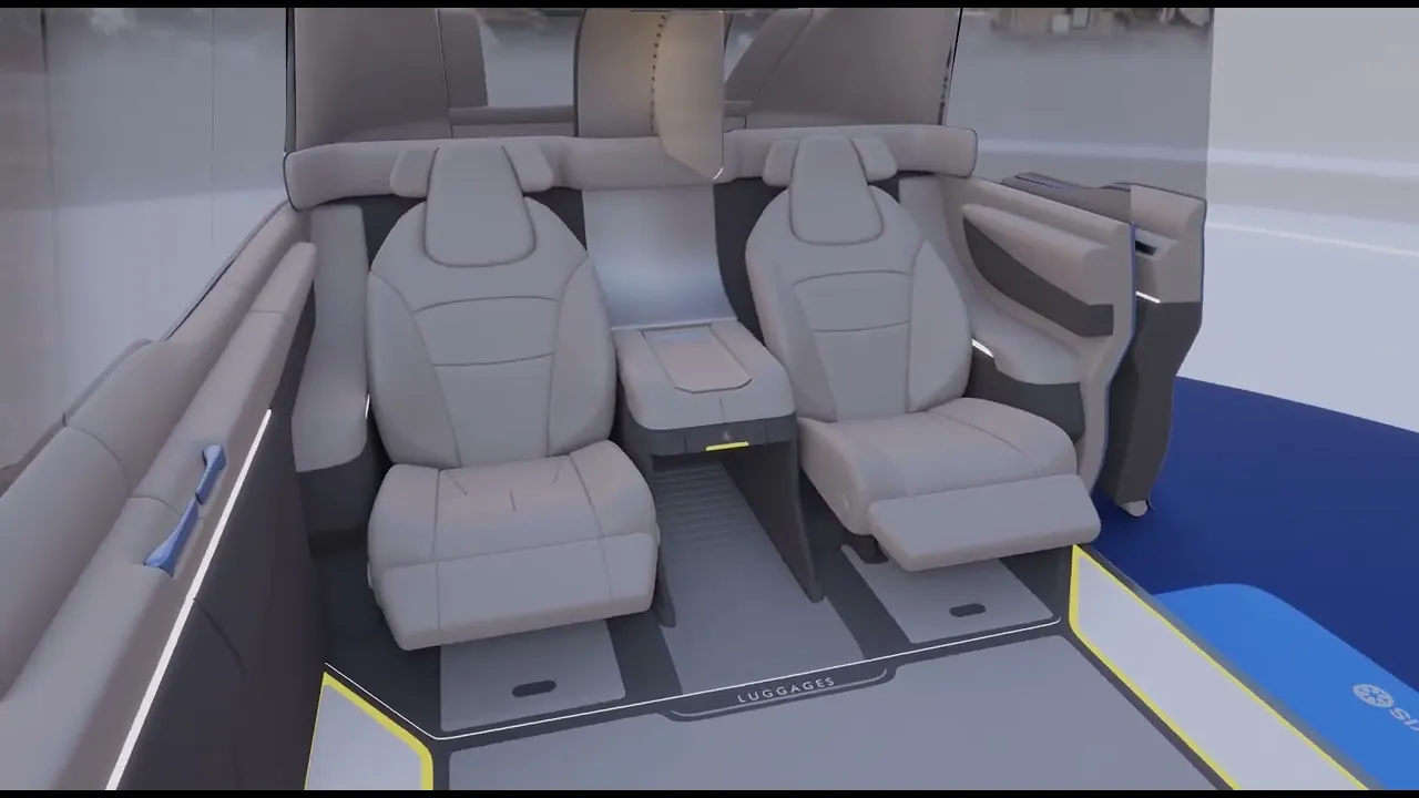 Soft, integrated LED lighting beneath the seats and along the walls creates a warm, soothing atmosphere. The adjustable intensity and color settings let passengers personalize the ambiance to suit their mood or time of day.